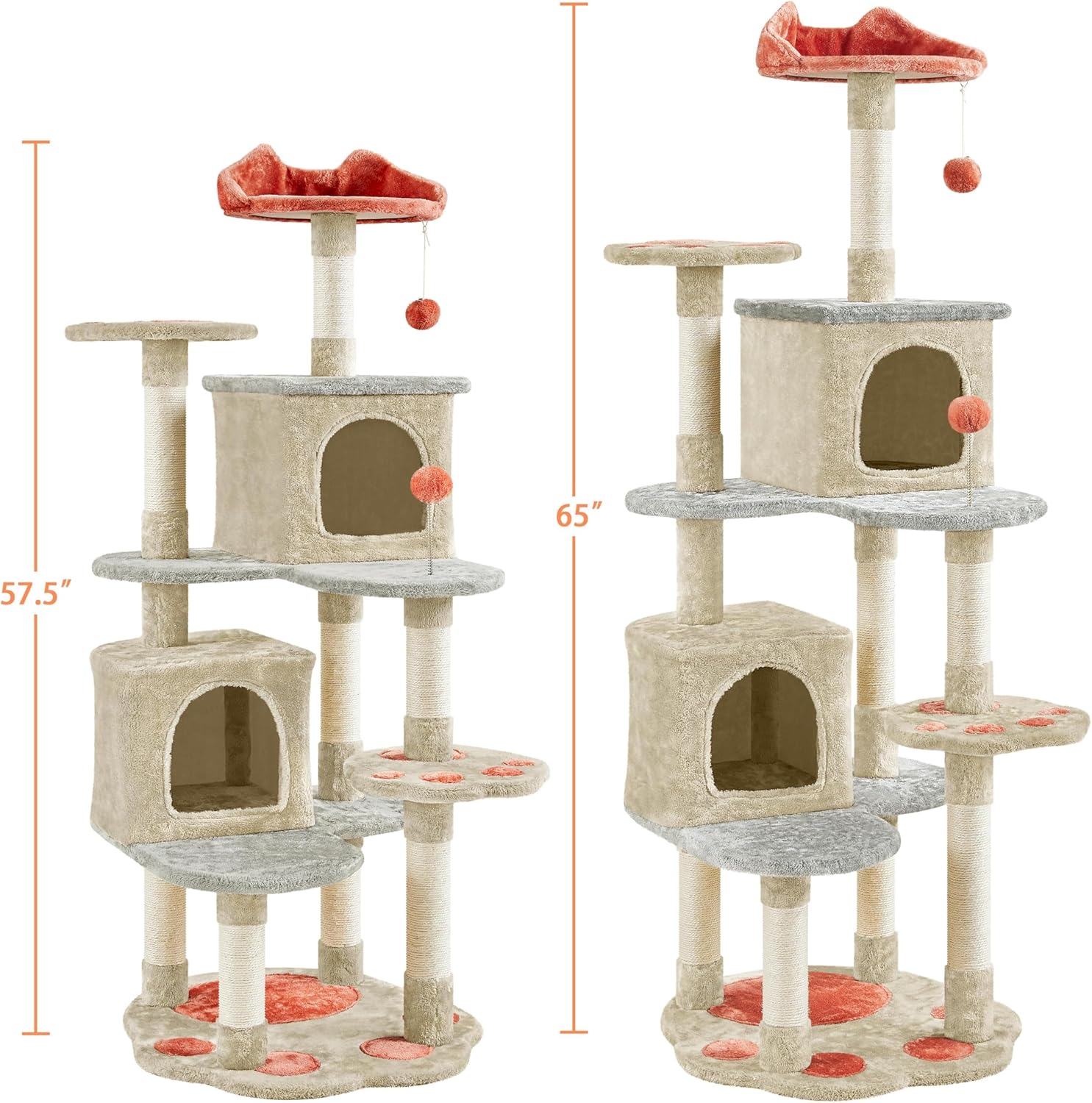 65in Cute Cat Tree, Cat Paw-Shaped Play Tower with Heart-Shaped Platform, Spring Ball & Hanging Ball, Double Condos, Scratching Posts, Cat Climbing Frame Bed Furniture for Indoor Cats