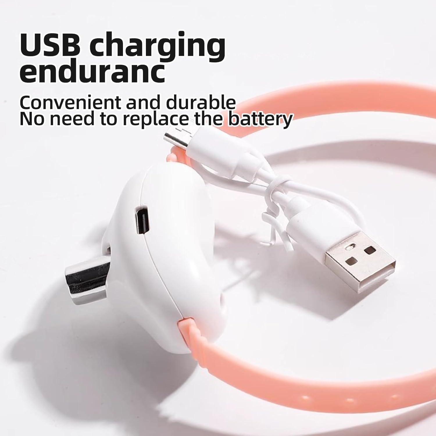 - Rechargeable -This cat collar light toy is rechargeable. The package comes together with a manual, and a charging cable which can be plugged in to charge. The working time is about 1-2 days after fully charged; Tips on how to wear: Make sure to wear this on with the charging port side facing to the bottom.